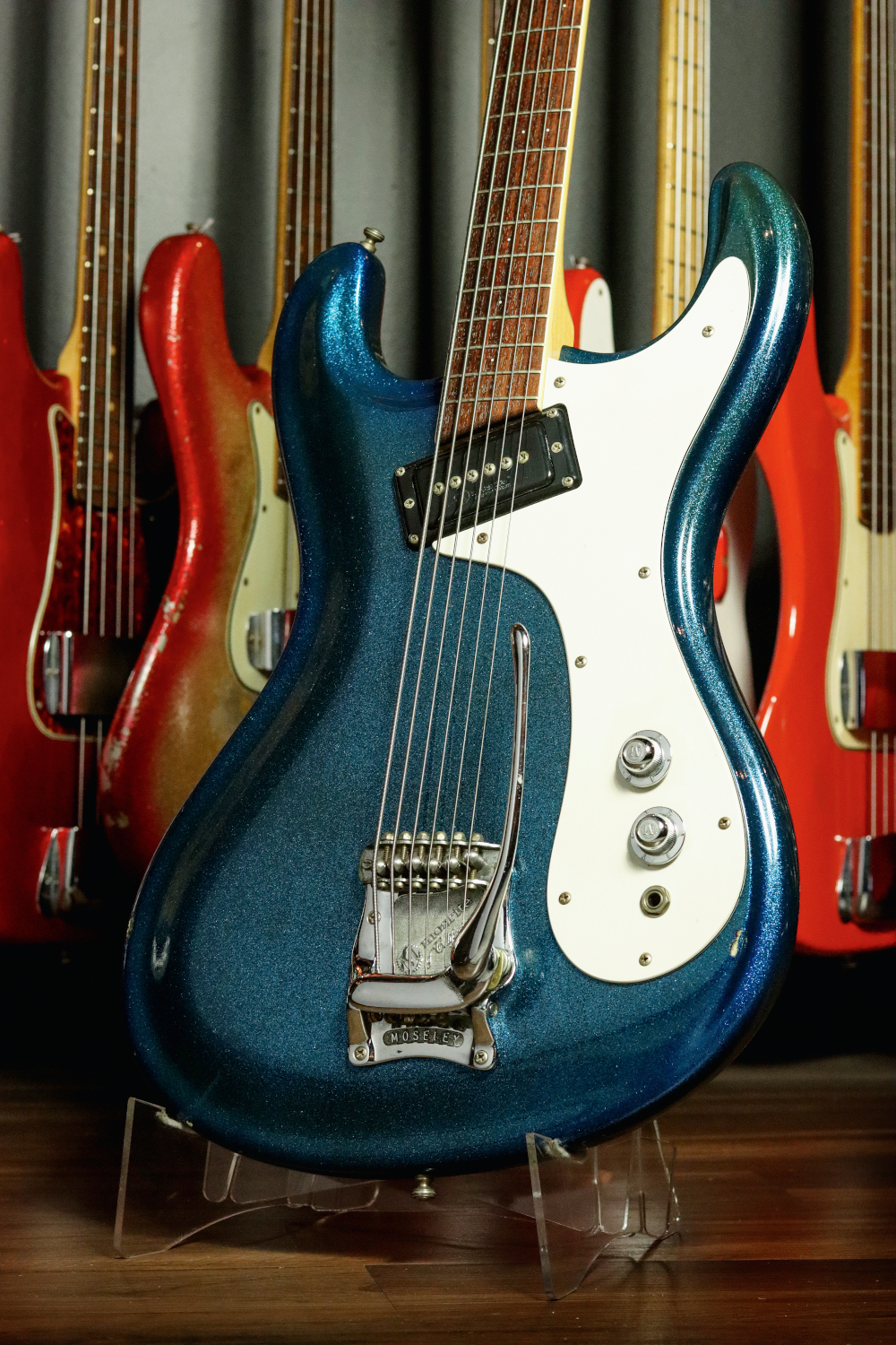 “This one has a very deep blue sparkle finish and it has the really cool ‘Bart Simpson’ tuners – they got the name because they look like a profile of the cartoon character Bart Simpson’s head! It’s also got a Mosrite vibrato that actually functions. I mean, it works fairly well. It’s an interesting design, but it’s an absolute rip-off of the spring-loaded Bigsby. The pickup is basically a six-polepiece guitar pickup.”