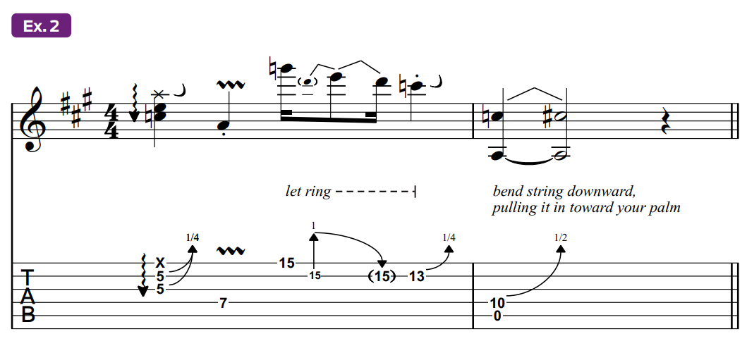 The rhythm of our example’s first bend release is notated strictly, but to summon the full desired effect, make the release as gradual as possible, its lowest point reached just a hair before you strike the following note.