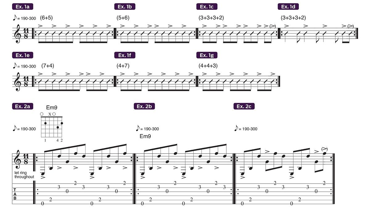 Choose a picking technique - pick only, fingerstyle or hybrid pick-and-fingerstyle (or better yet, all three) - and have at the 6 + 5 grouping in Ex. 2a, the 5+6 grouping in Ex. 2b and the 3 + 3 + 3 + 2 subdivision in Ex. 2c. Though all three are similar, it’s the different sets of accents that make each one unique.