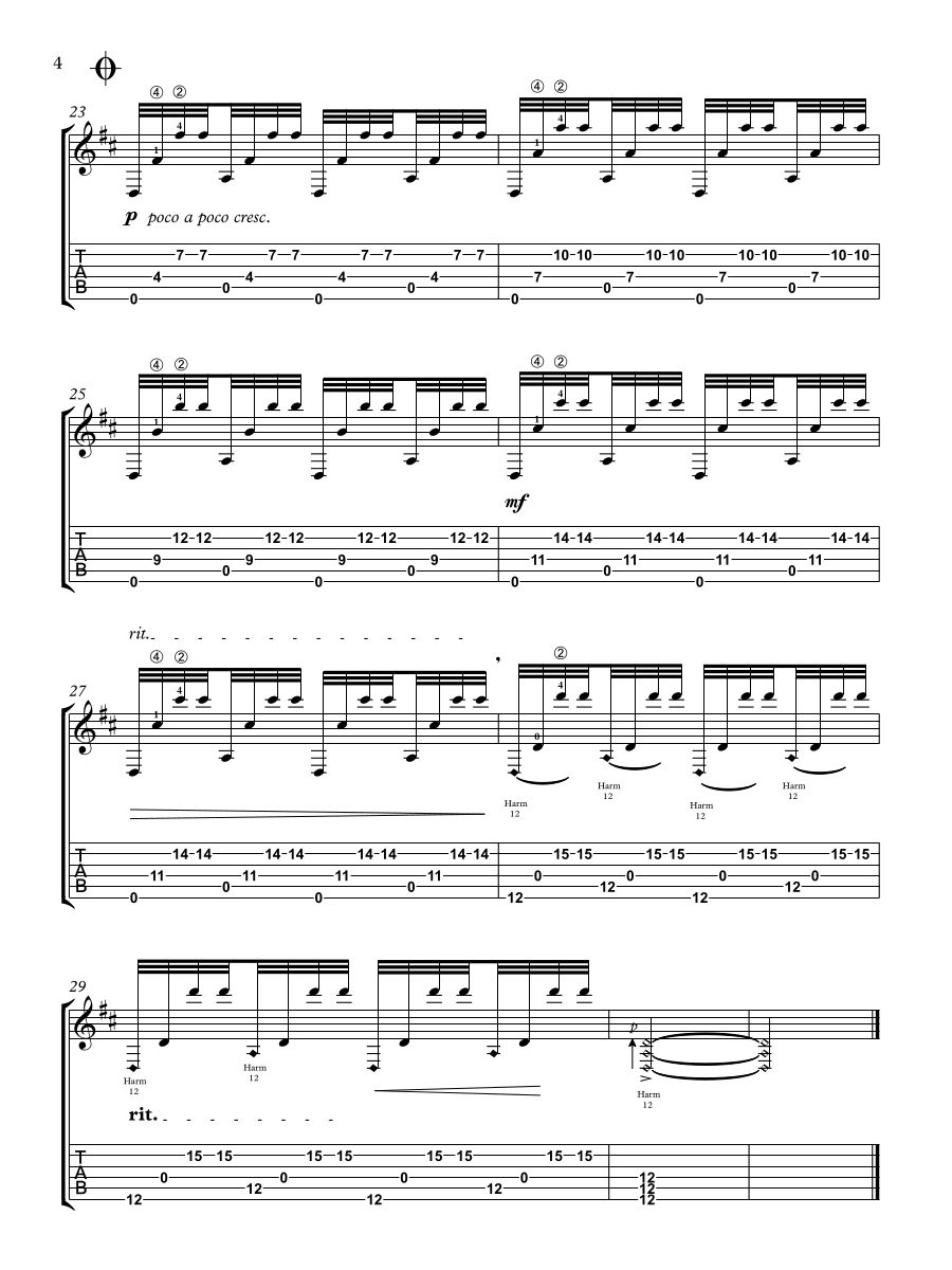 The key recurring technical element of this piece, which is performed on a nylon-string acoustic guitar in drop-D tuning (low to high, D A D G B E), is the repeating right-hand fingerpicking pattern p, i, a, m – or thumb, index, ring, middle. At its base, the sequence is a modified tremolo. Tremolo is a flamenco guitar technique that customarily involves picking a bass note with the thumb, followed by a melody note on one of the treble strings that is quickly rearticulated three times, which creates the aural illusion of a single held note that can be used to emulate the lyrical sustaining tones of the human voice or an instrument such as the flute or violin. The sequence is then typically repeated with single bass notes moving across the bottom three strings, one note per string, to form slow-moving arpeggios beneath the tremolo-picked melody.