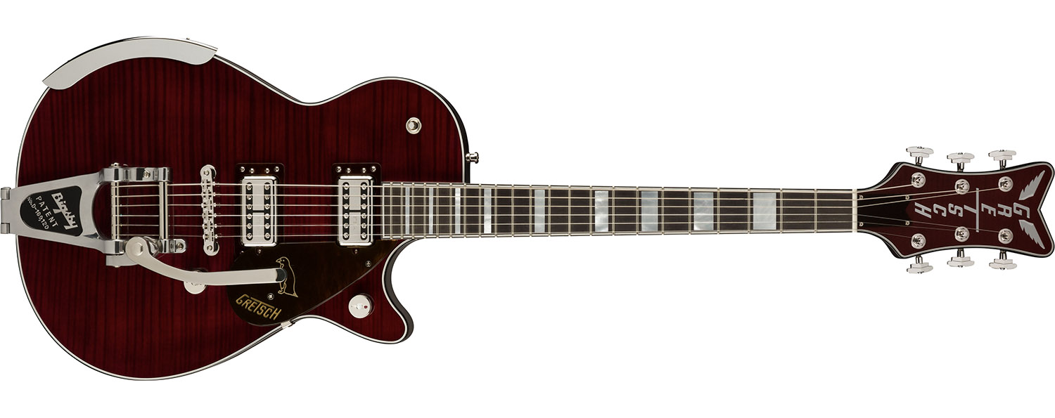 …And they really do look magnificent, with flame maple tops, jeweled Gretsch arrow knobs, and finish options comprising Dark Cherry Metallic Flame and Amber Flame.