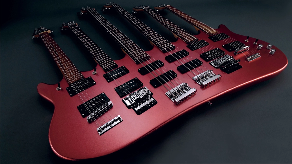 Its single solid body is over three feet wide and boasts a Metallic Red finish. Each of its necks is made of rosewood, and the guitar weighs in at a whopping 37 pounds.